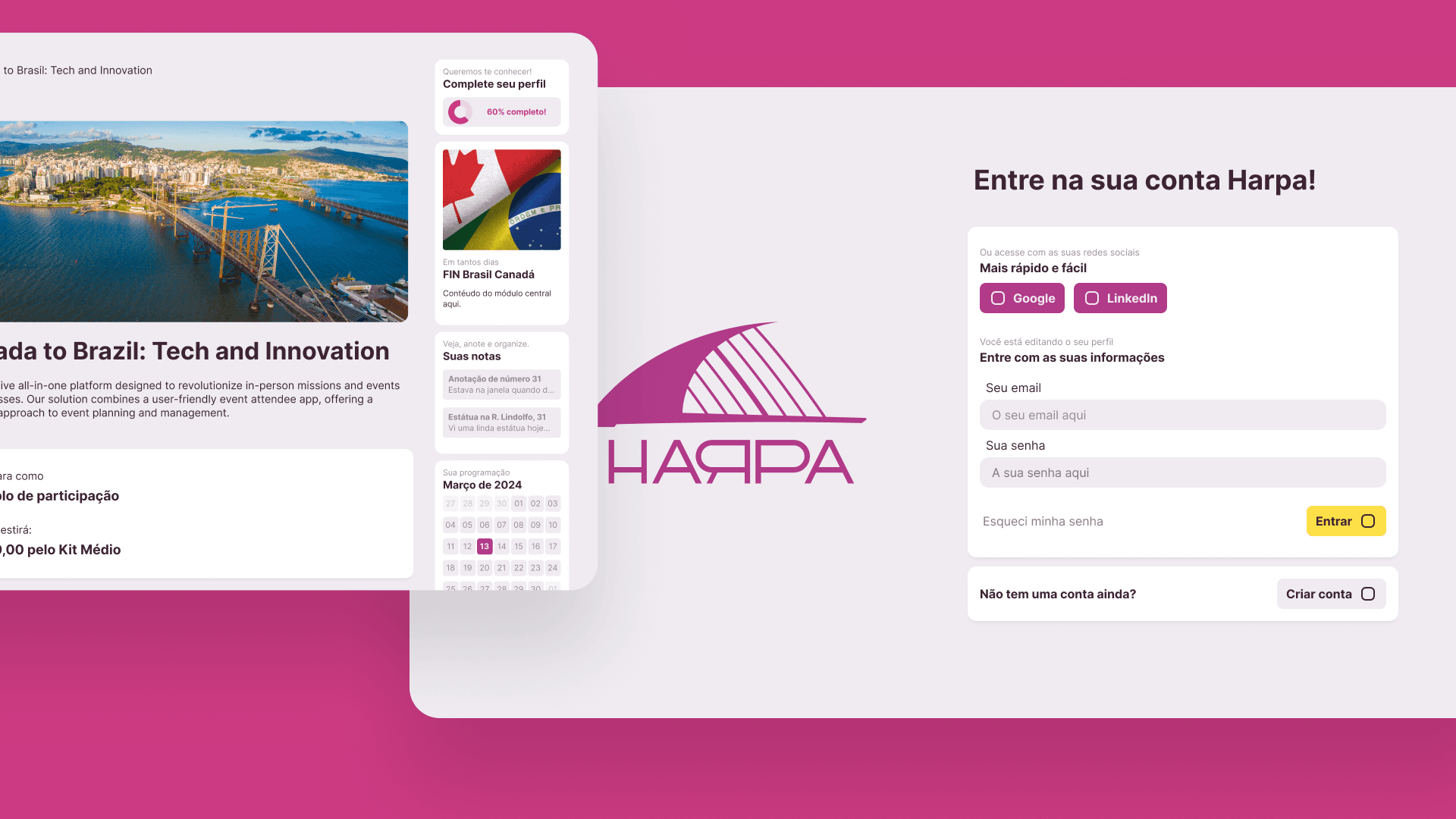 Construção da jornada do usuário e prototipagem de uma plataforma desktop e mobile para gerenciamento de missões internacionais. Projeto incluiu definição da estrutura, sistema de design e marca do produto.